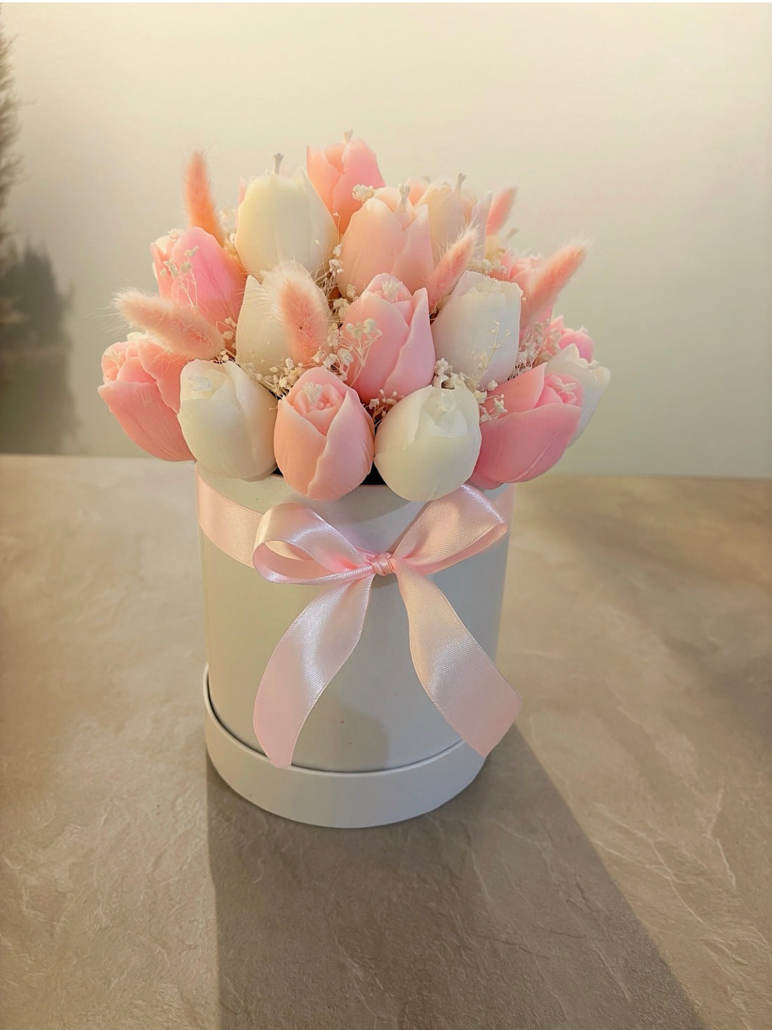 En drömmig ljusbukett med handgjutna tulpanljus i krämigt vitt och mjuka rosa nyanser, dekorerad med...