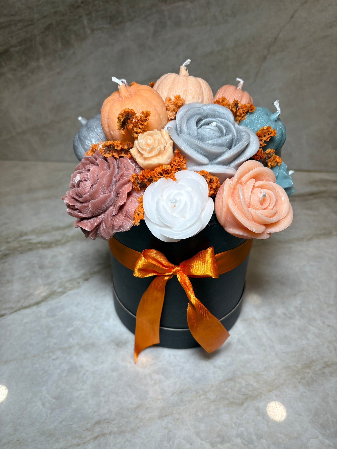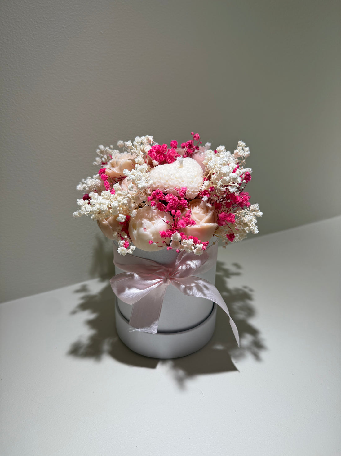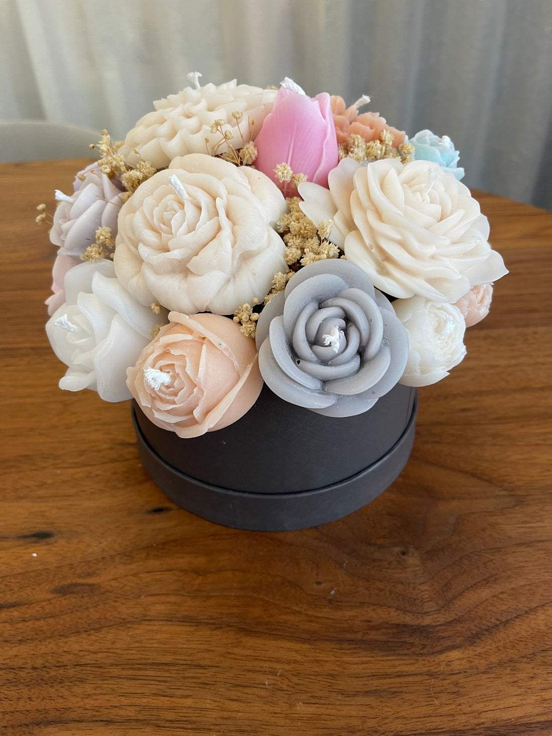 Ljusbukett gjord av stearin och sojavax , Lila och vita blommor Perfekt som födelsedags present...