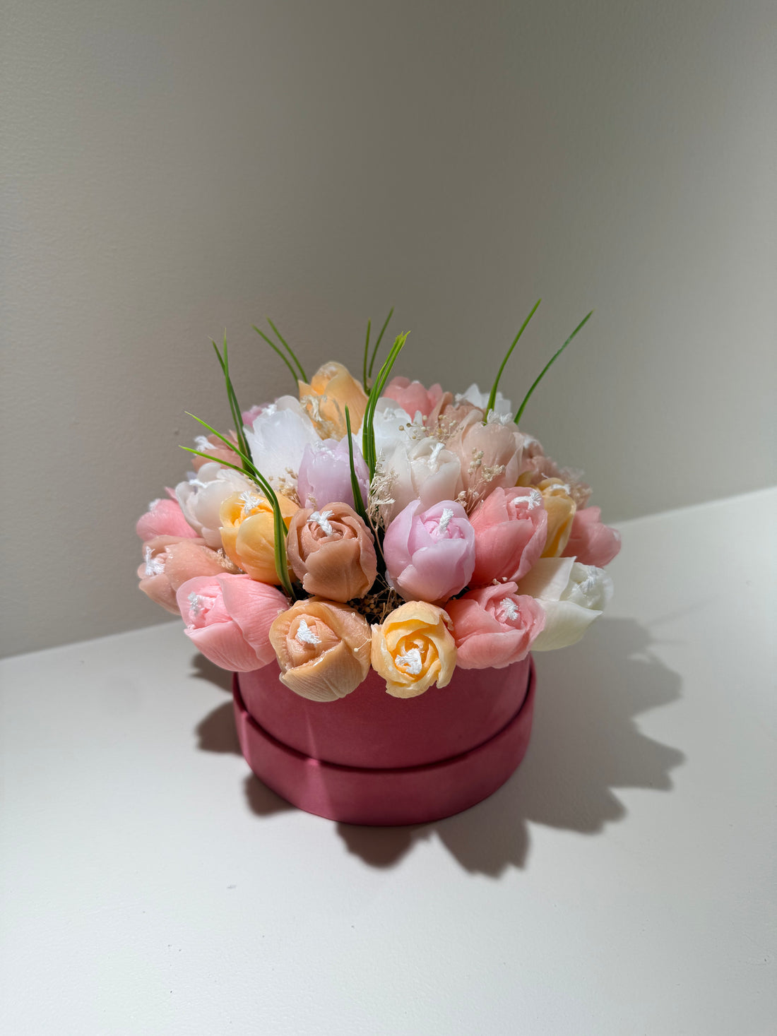 Leverans är 5-10 dagar Vacker bukett gjord av vax i rosa velvet box. strl H18cm....
