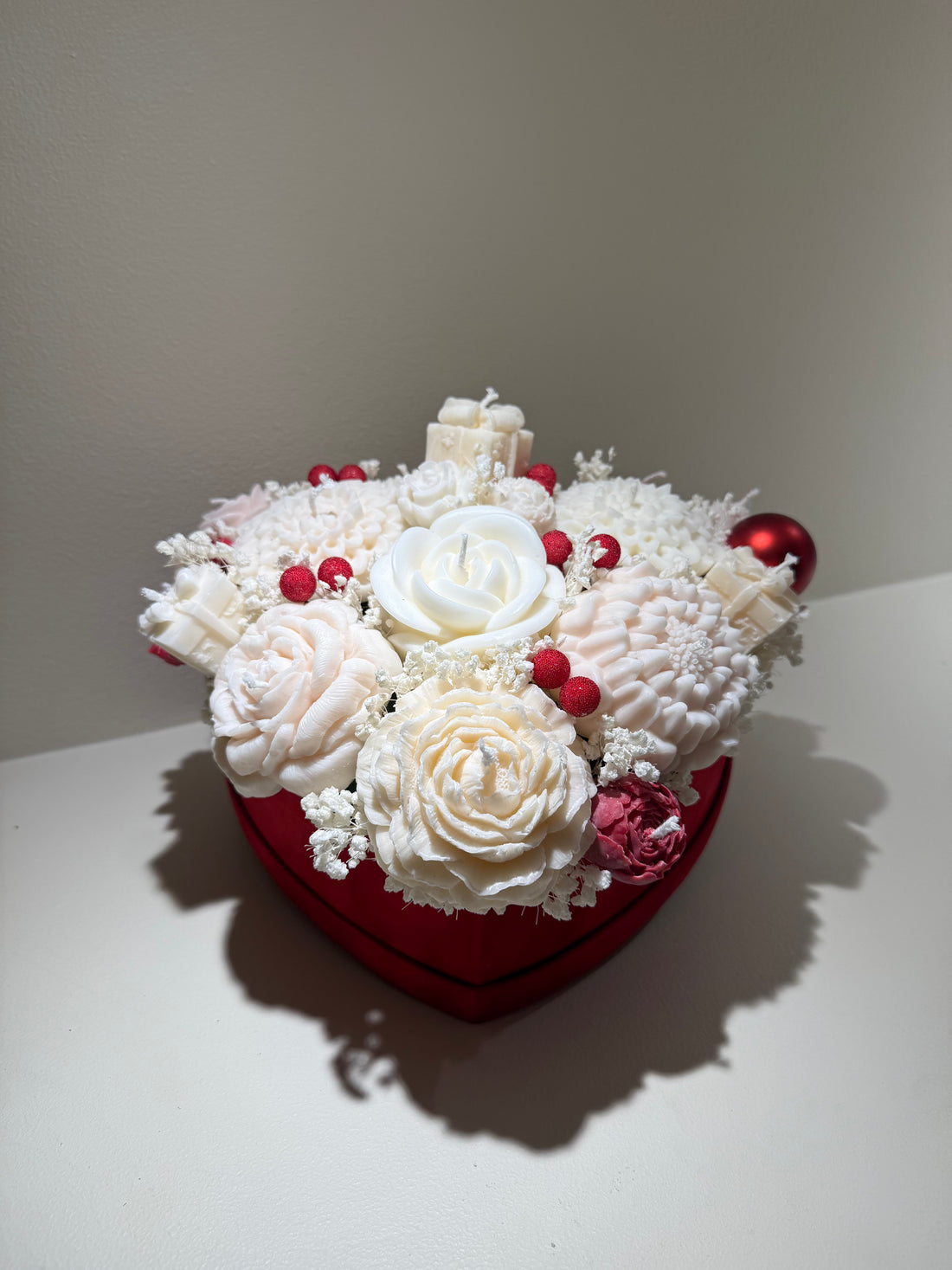 Vacker hjärtformad bukett gjord av vax i lyxyg velvetbox.H15cm. B 28cm