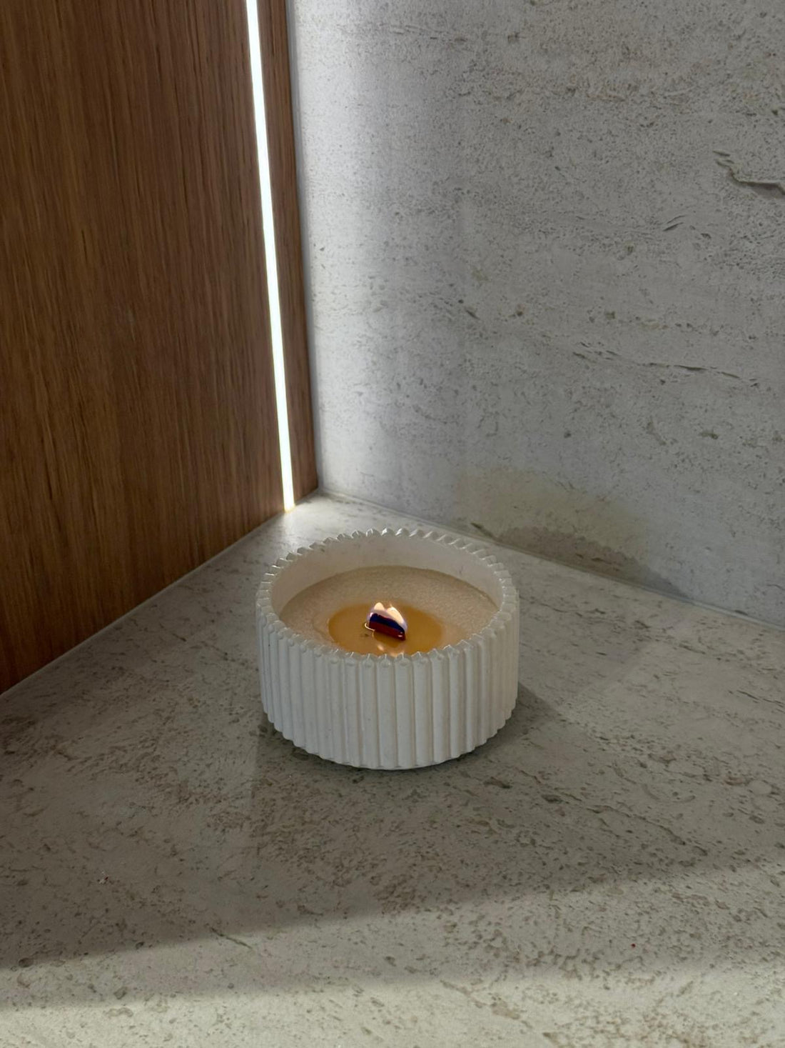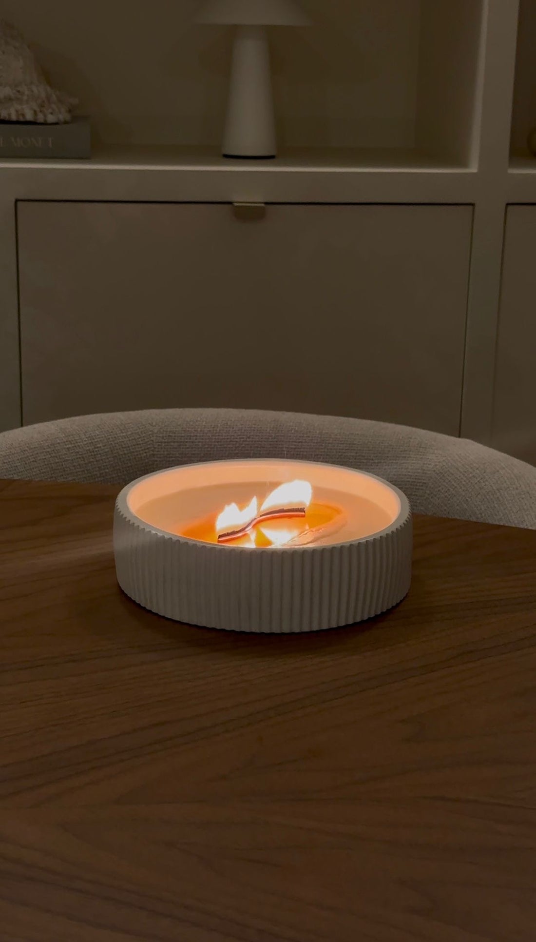 Stilrent ljus med träveke ✨ Ett elegant och lågmält designljus i ribbad keramikskål med mjukt...