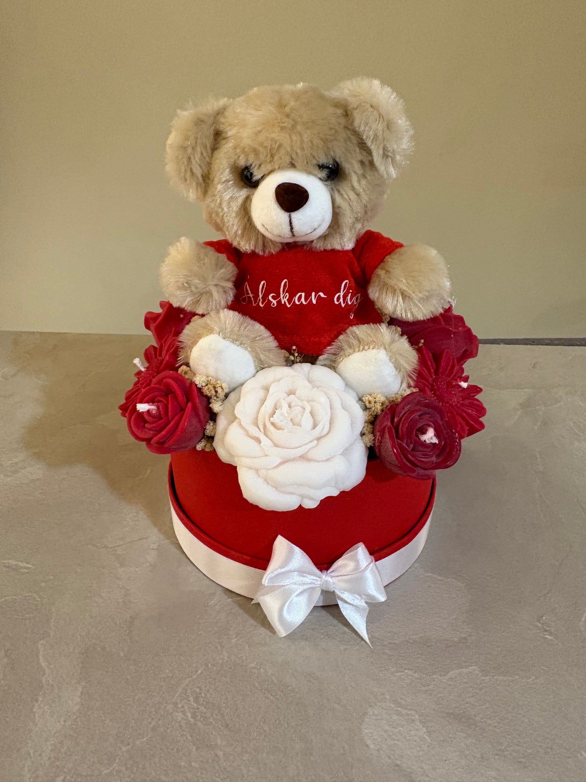 Romantisk bukett i elegant box med mjuk nalle och handgjorda rosor.