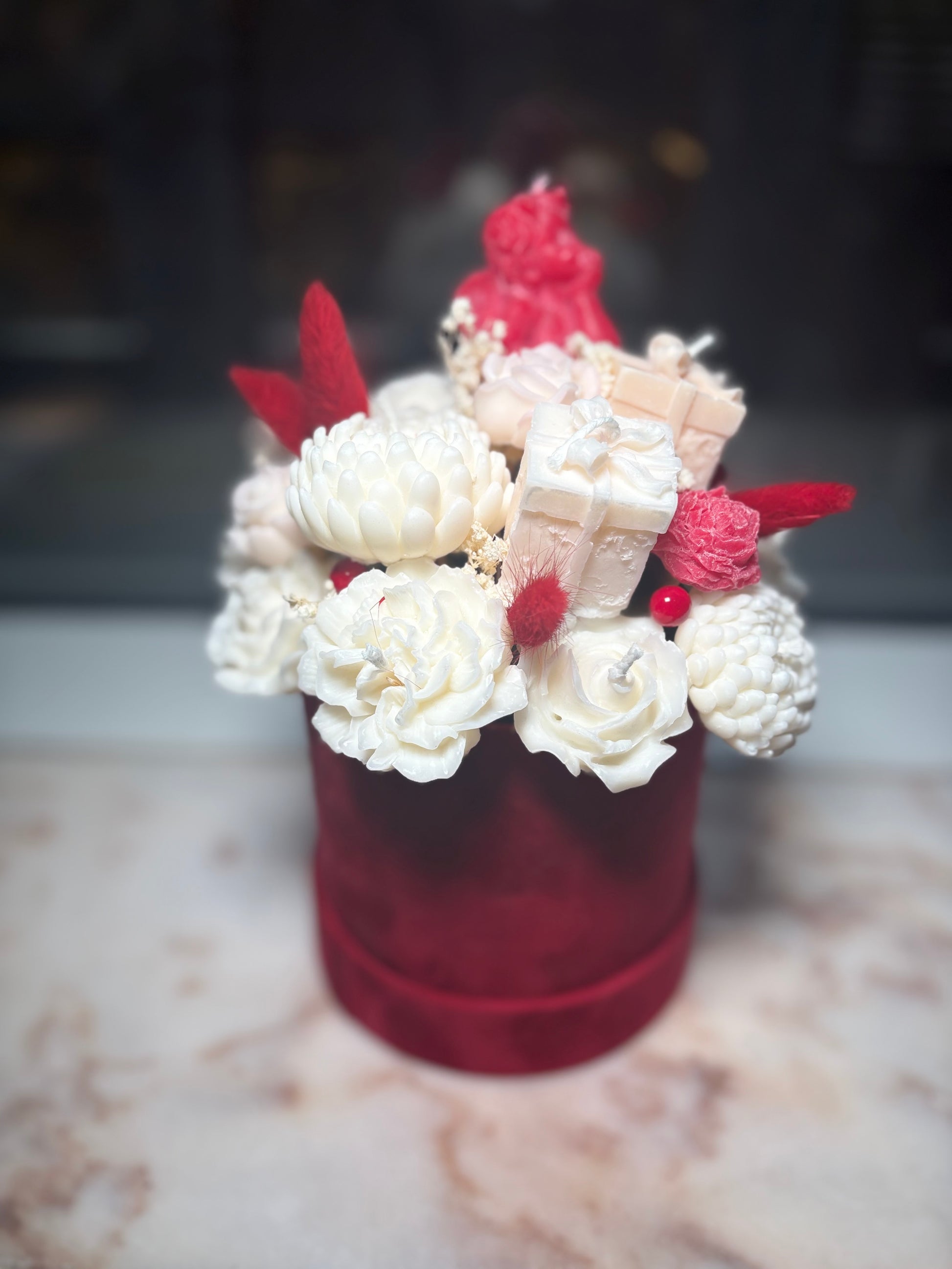 Vacker bukett gjord av vax i lyxyg velvet box , fantastisk till Jul som julklap eller ha den hemma på soffbordet