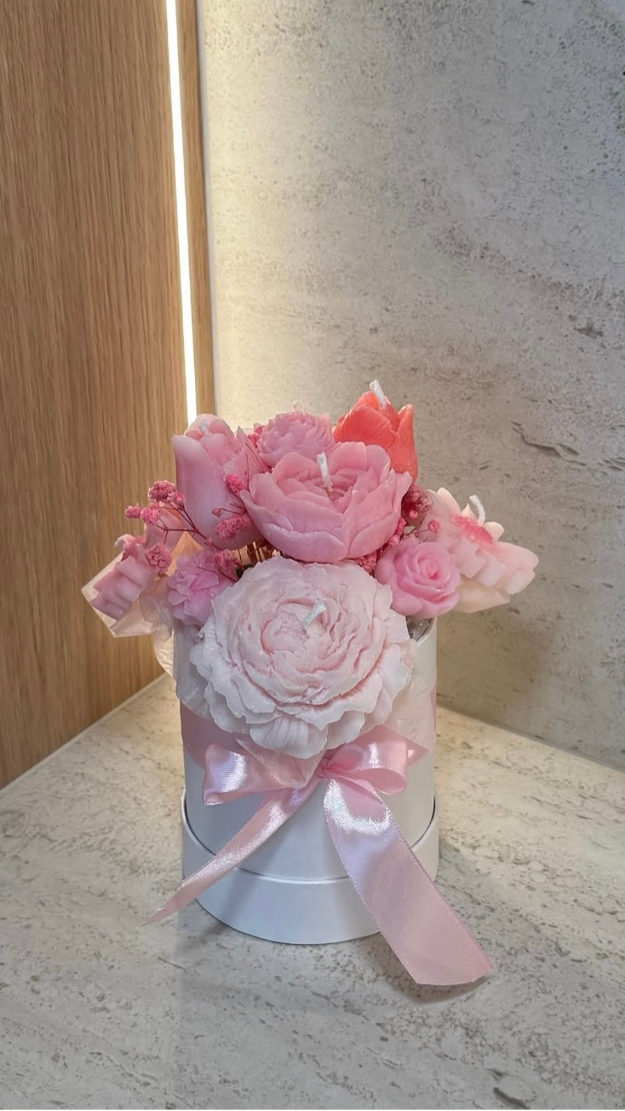 Frakt inom hela Sverige eller hämta på plats. Ljusbukett gjord av stearin- och sojavax.