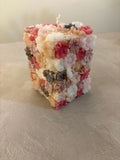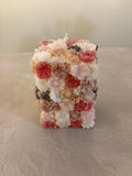 Handgjort dekorljus med individuellt formade vaxblommor.