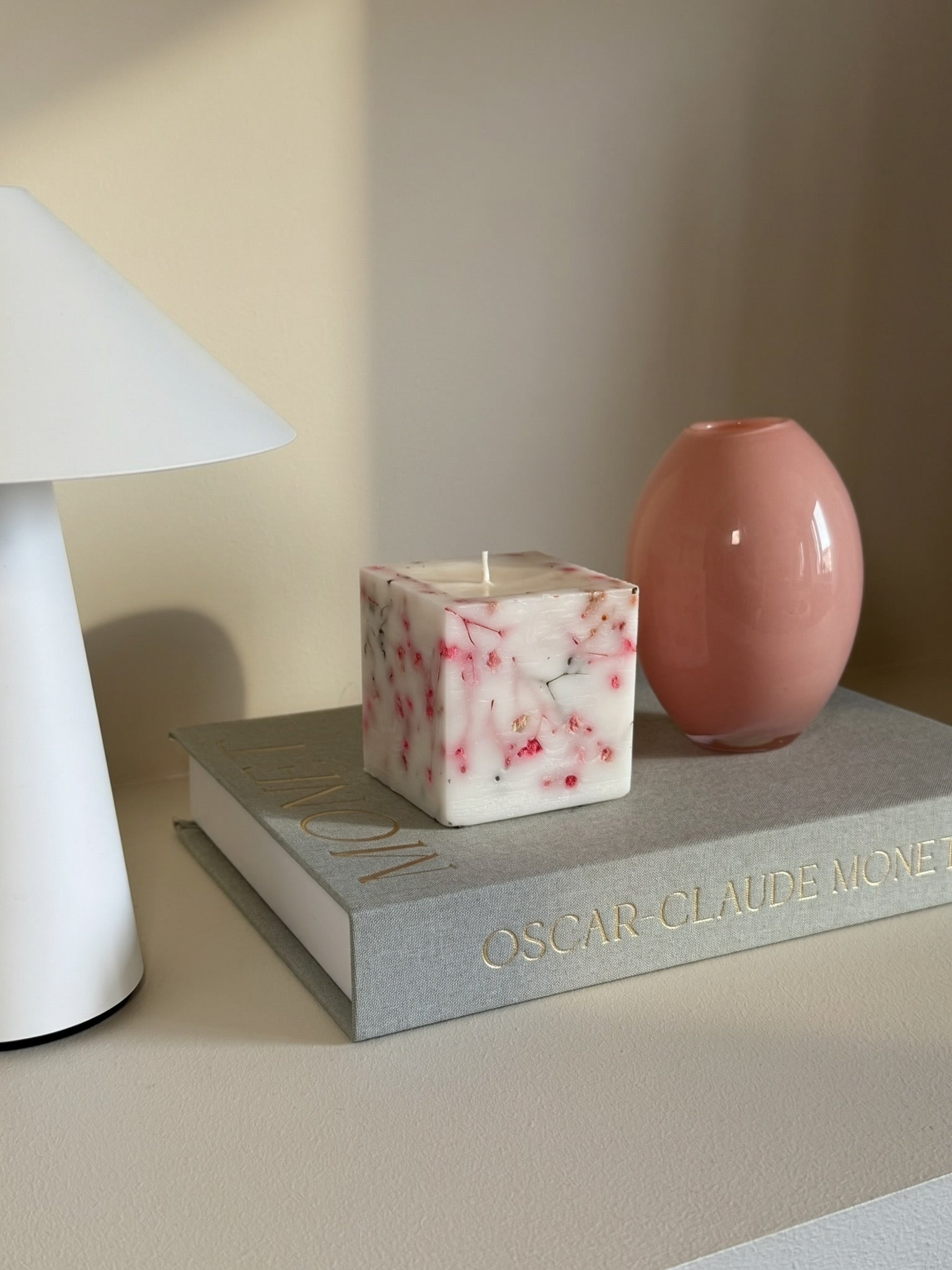Ett dekorativt, handgjutet ljus där botaniska inslag möter tidlös minimalism. Blush Botanica är gjutet i ett mjukt krämvitt vax med inbäddade rosa blomdetaljer som gör varje ljus unikt. Den kubiska formen ger ett modernt uttryck, medan de botaniska elementen skapar en romantisk och levande känsla.
