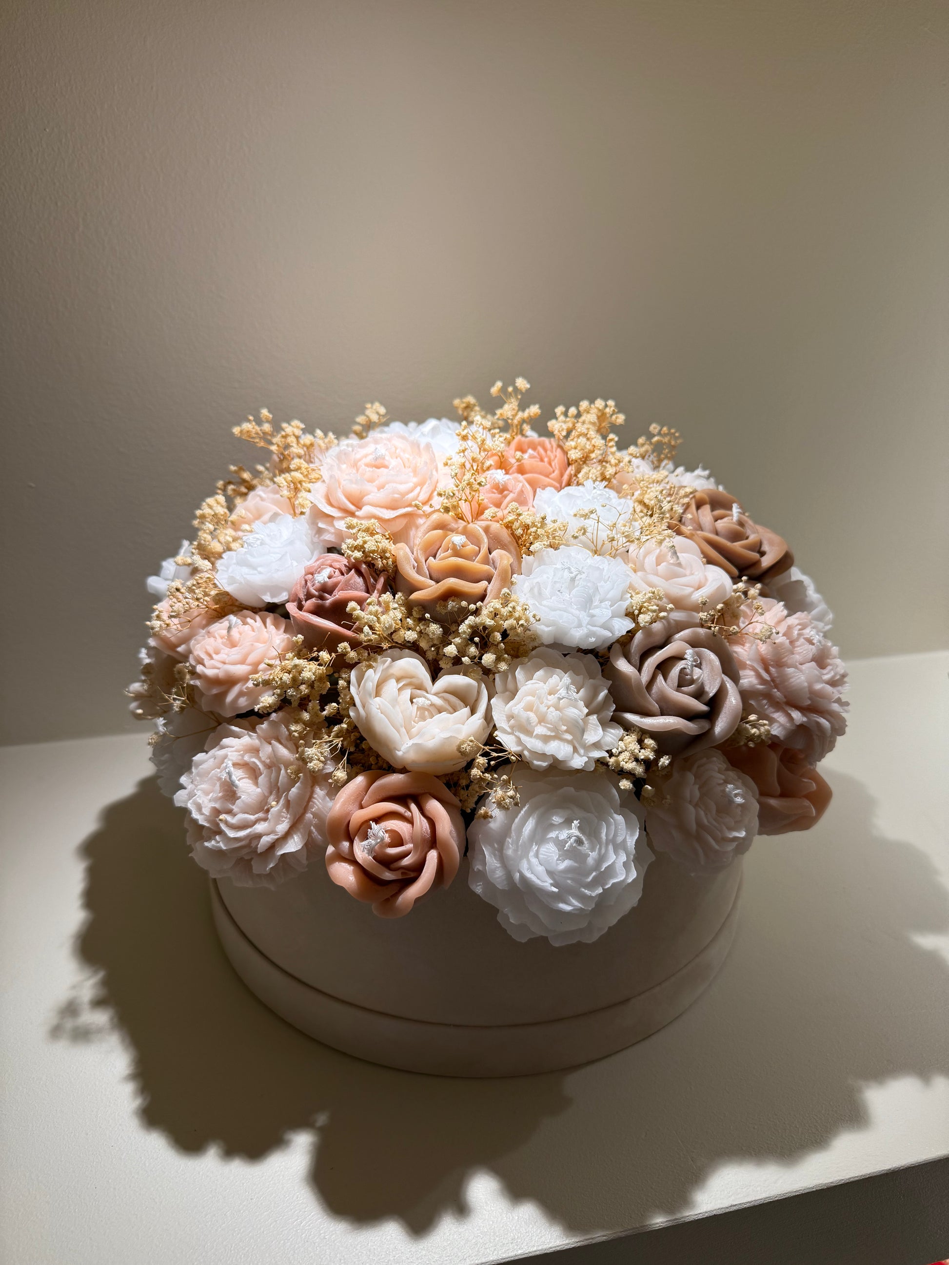 En av våra större buketter, tillverkad i vax och i en lyxig benvit velvetbox. Med noggrant utvalda jordnära färger.