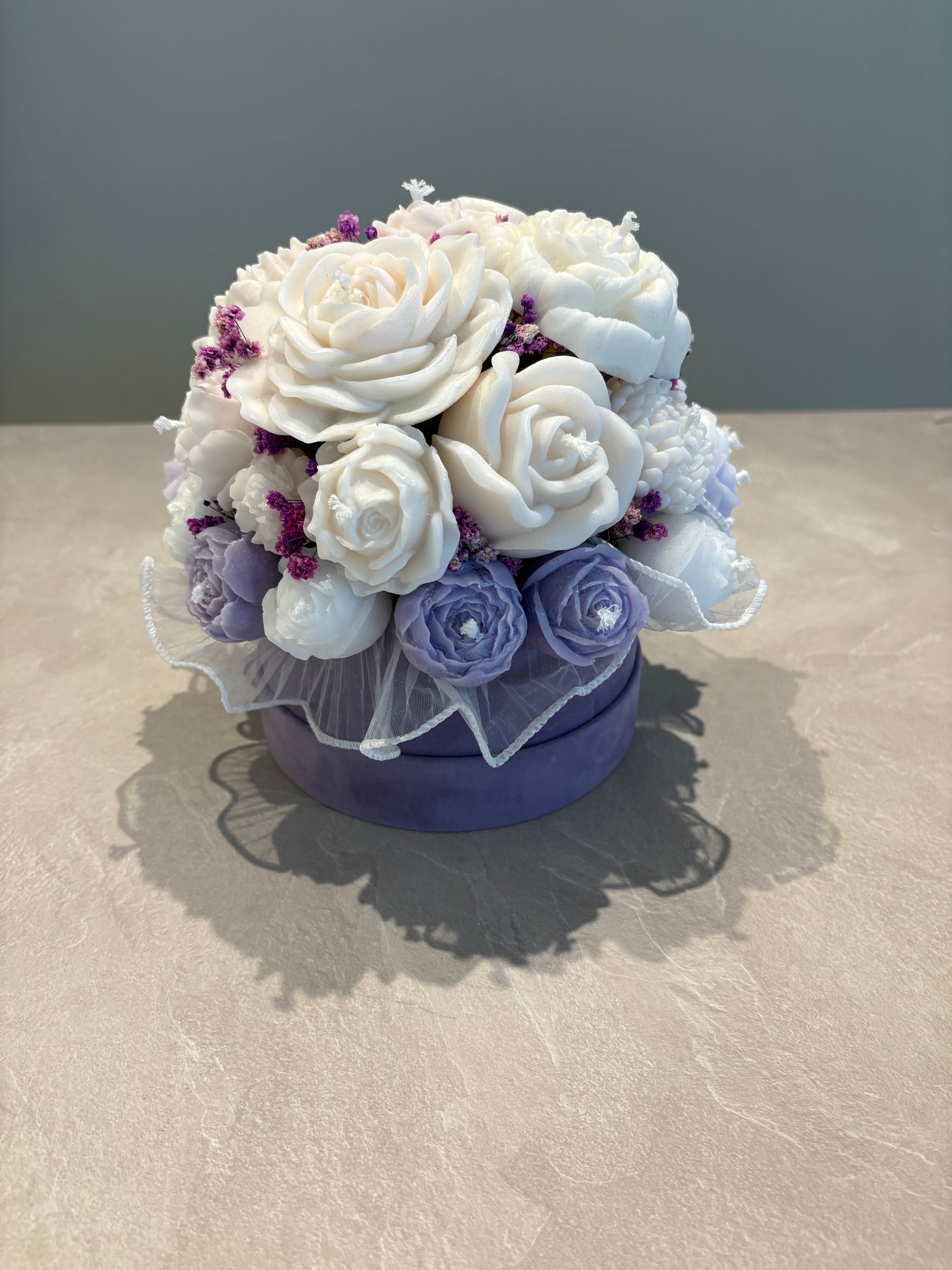 Bukett gjord av vax i lyxig lila velvet box med matchande färger