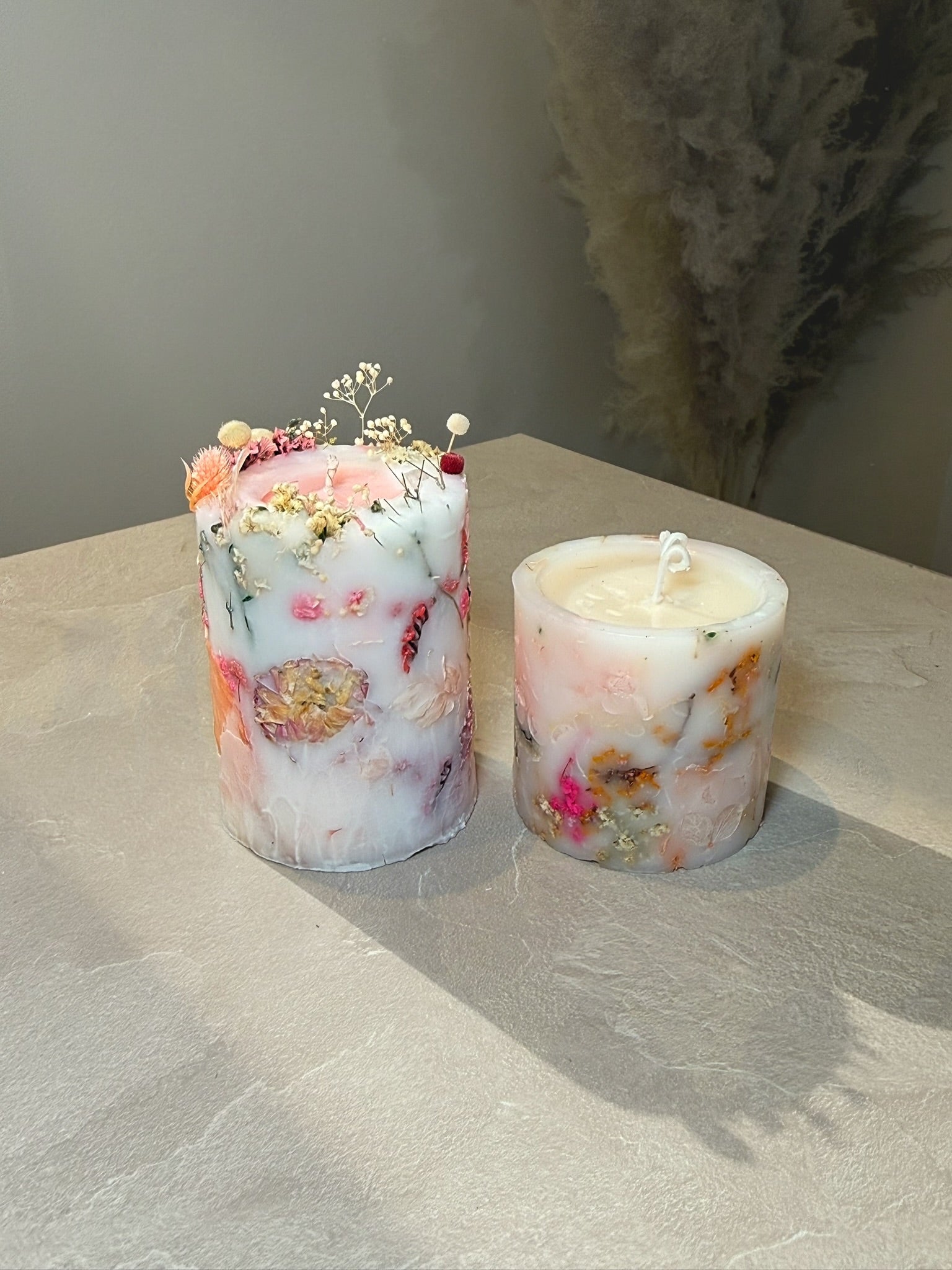 Ett exklusivt handgjort ljus med inbyggda torkade blommor, där varje detalj är noggrant formad för ett elegant och tidlöst uttryck. En unik inredningsdetalj som förhöjer hemmets atmosfär
