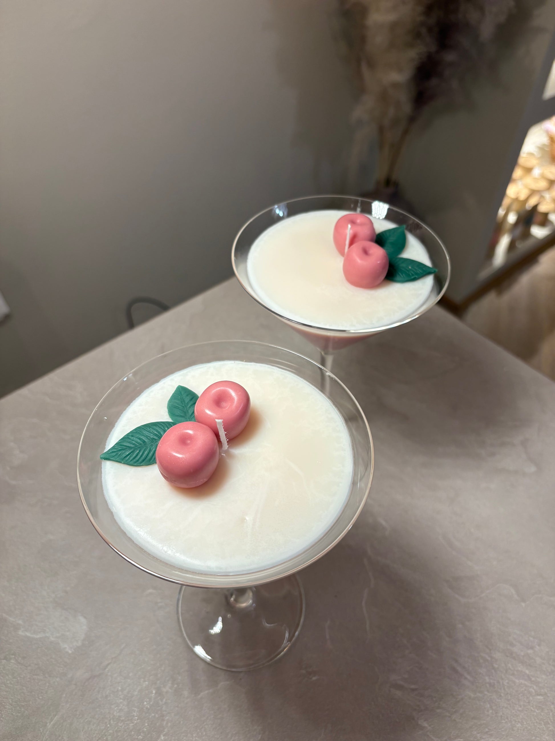 Skapa en varm, romantisk atmosfär med detta unika och handgjorda koktelljus. dekorerat med körsbär
