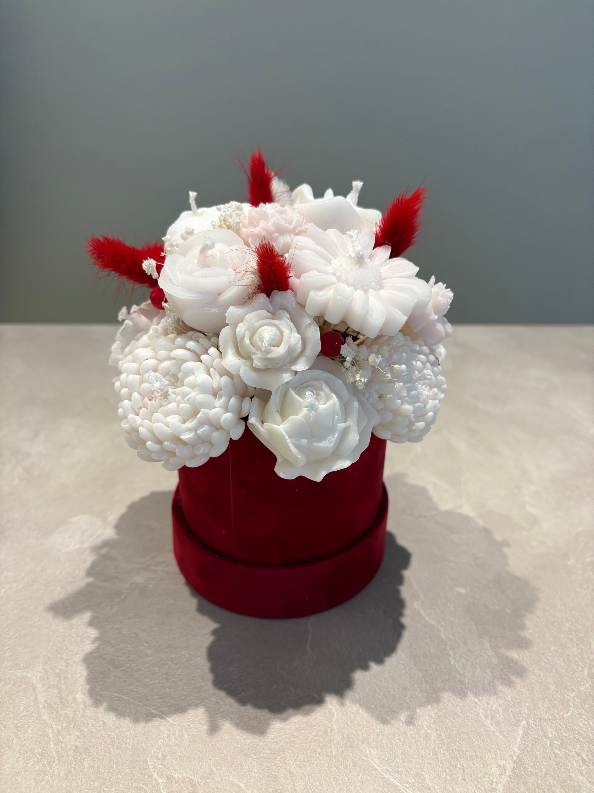 En exklusiv ljusbukett med handformade rosor i vax och noggrant utvalda detaljer. En tidlös present som kombinerar hantverk, design och något gott.