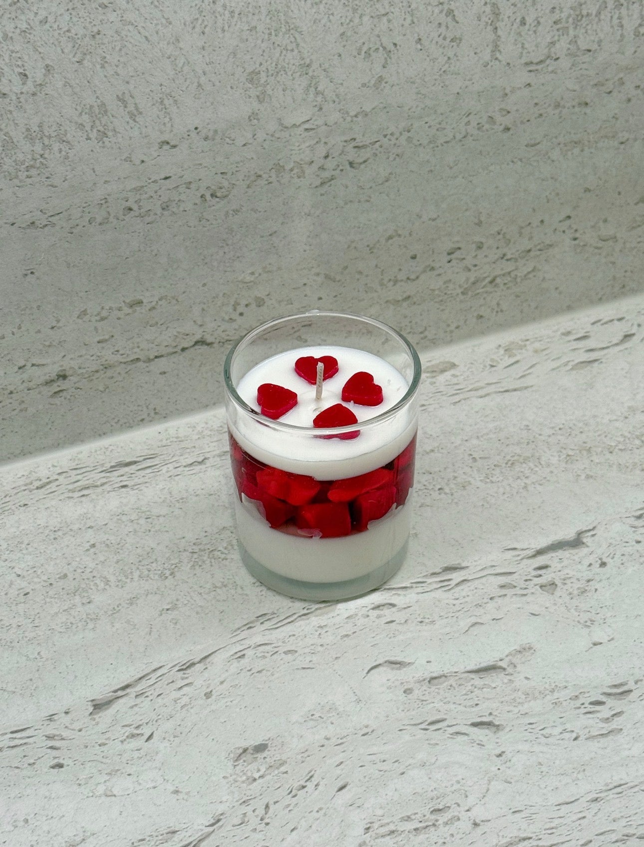 Ljus i glas behållare fylld med soja vax och gelé vax , dekorerad med små röda hjärtan