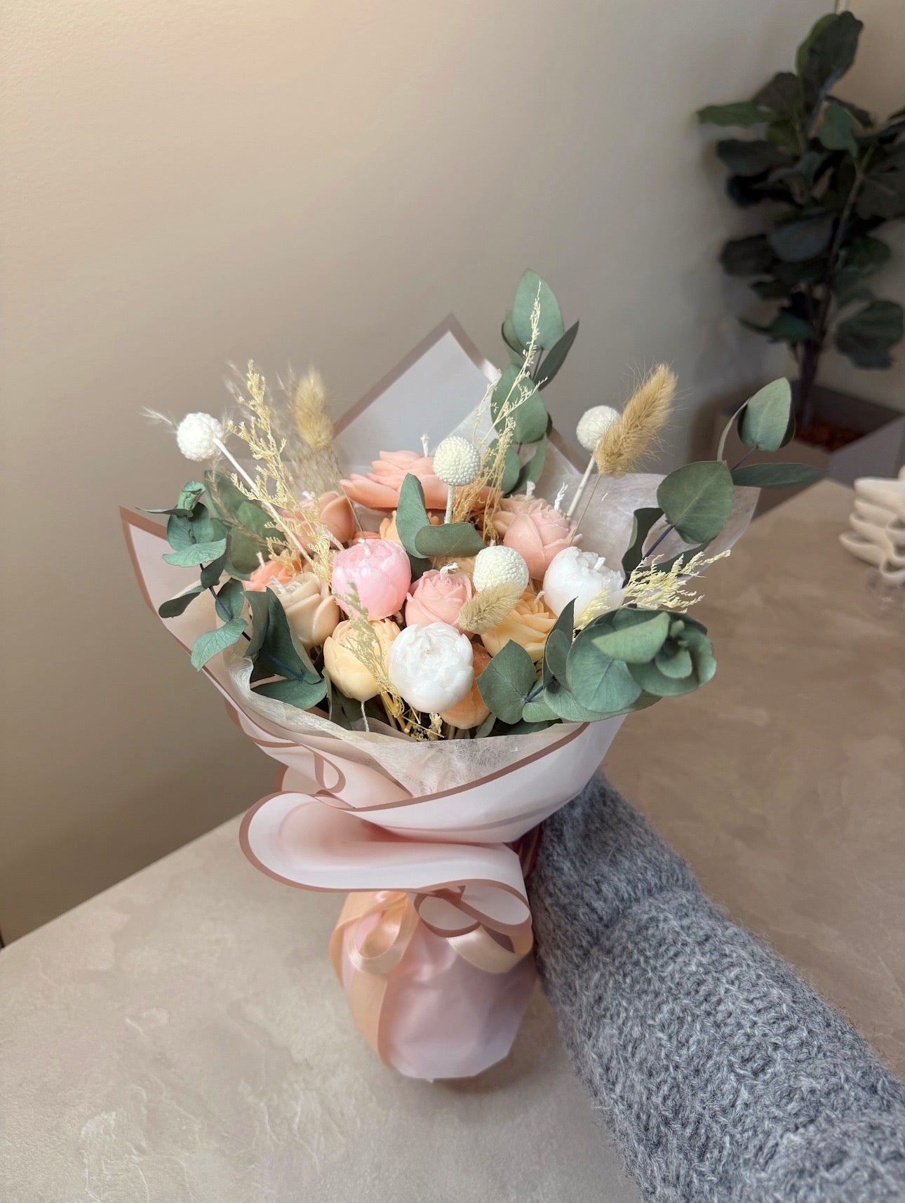 Handgjort ljusbukett för vas , vackra jordnära färger med torkade eukaliptus med fin grön färg som har den fantastiska doften kvar