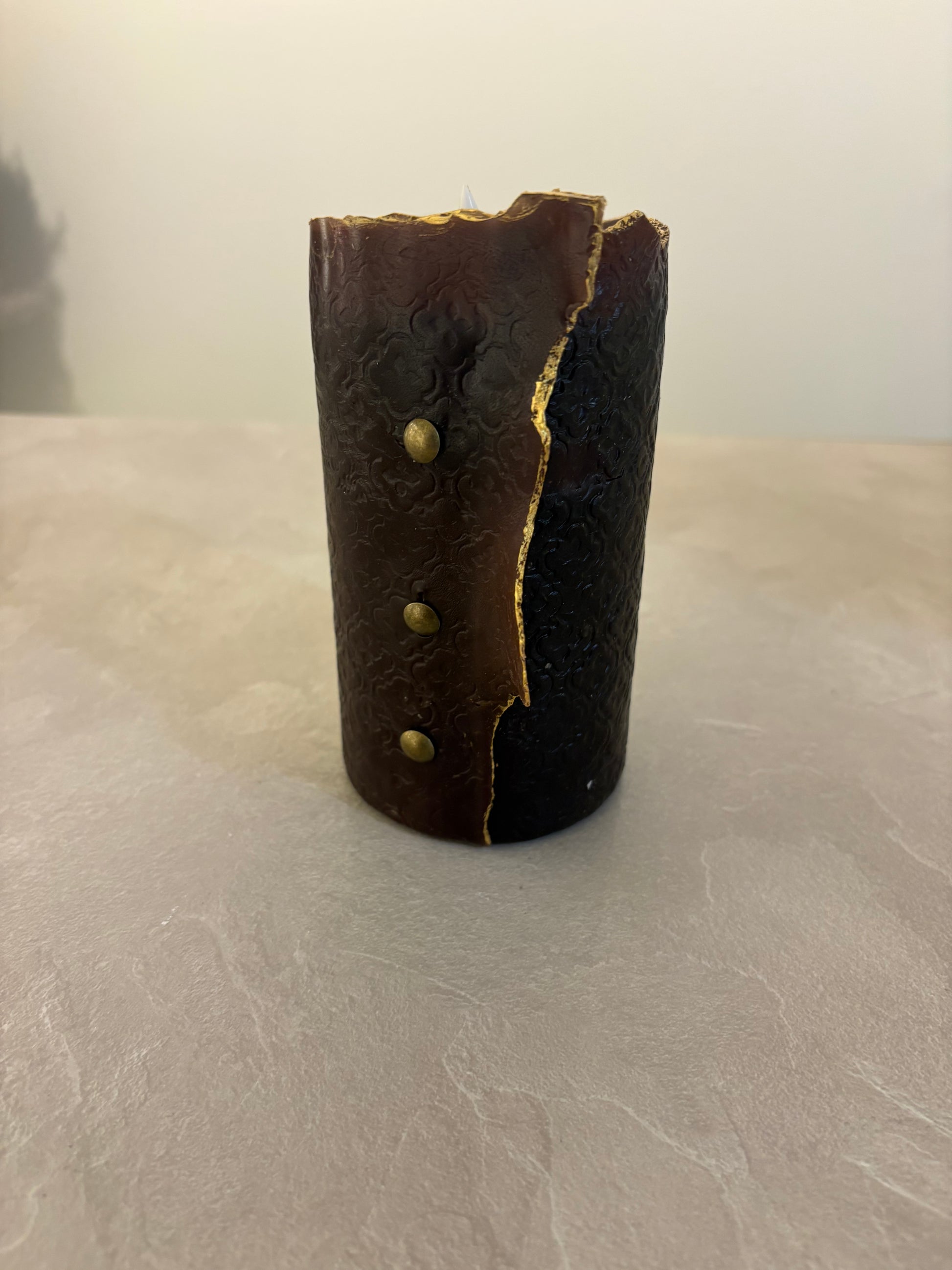 Ett stilfullt och unikt ljus där form möter hantverk. Den mjukt böljande öppningen framhävs av en tunn guldkant som fångar ljuset på ett vackert sätt. De dekorativa detaljerna ger en subtil vintagekänsla och gör varje exemplar personligt. En elegant inredningsdetalj som skapar lugn och atmosfär.