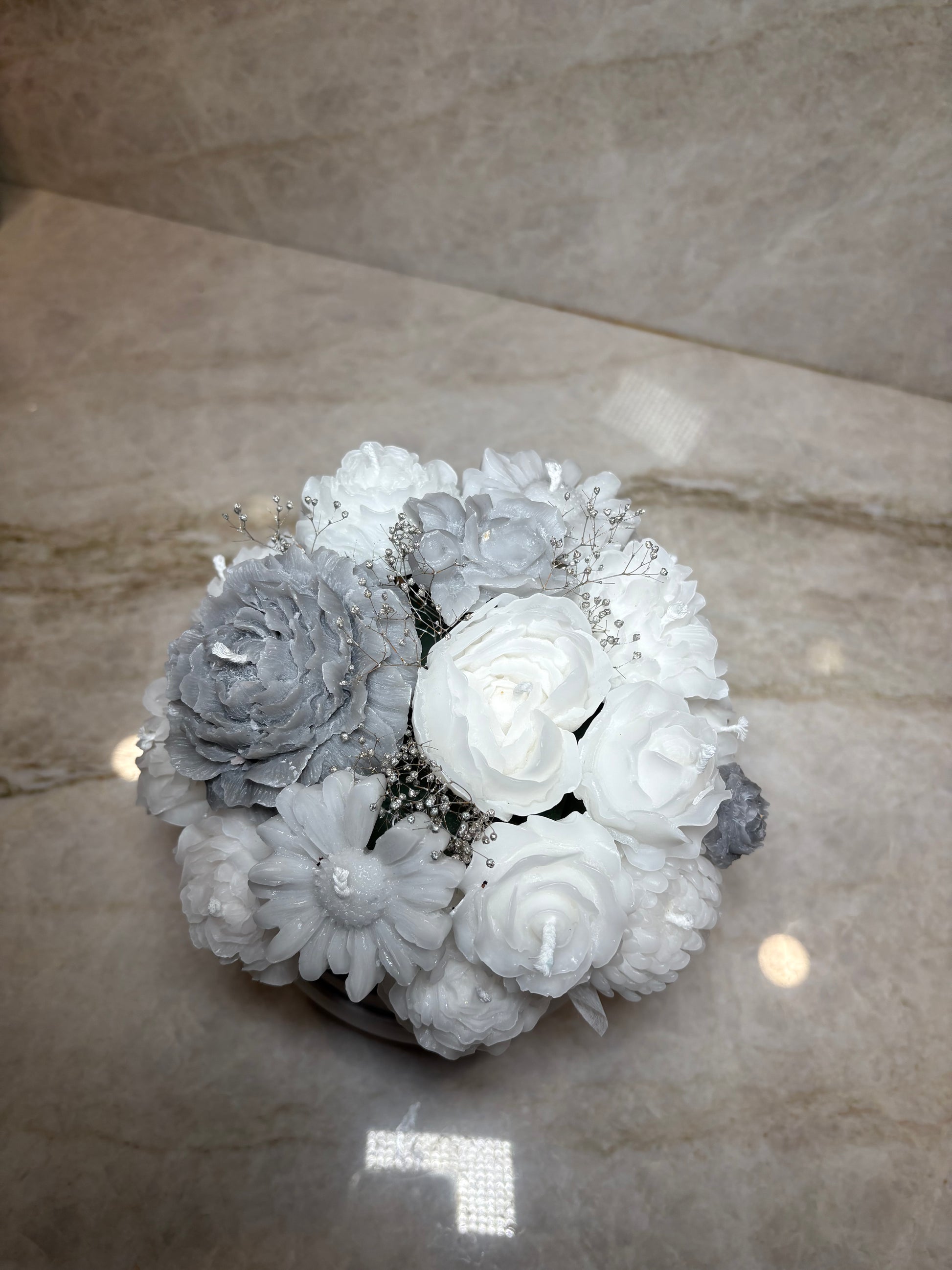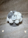 Frakt inom hela Sverige eller upphämtning på plats. Stilren handgjord vaxbukett i vitt och silver med lyxig velvet box– En exklusiv kombination av rosor och pioner i eleganta kontraster. Den tidlösa färgskalan gör buketten perfekt som en sofistikerad inredningsdetalj eller som en unik gåva som håller för alltid.