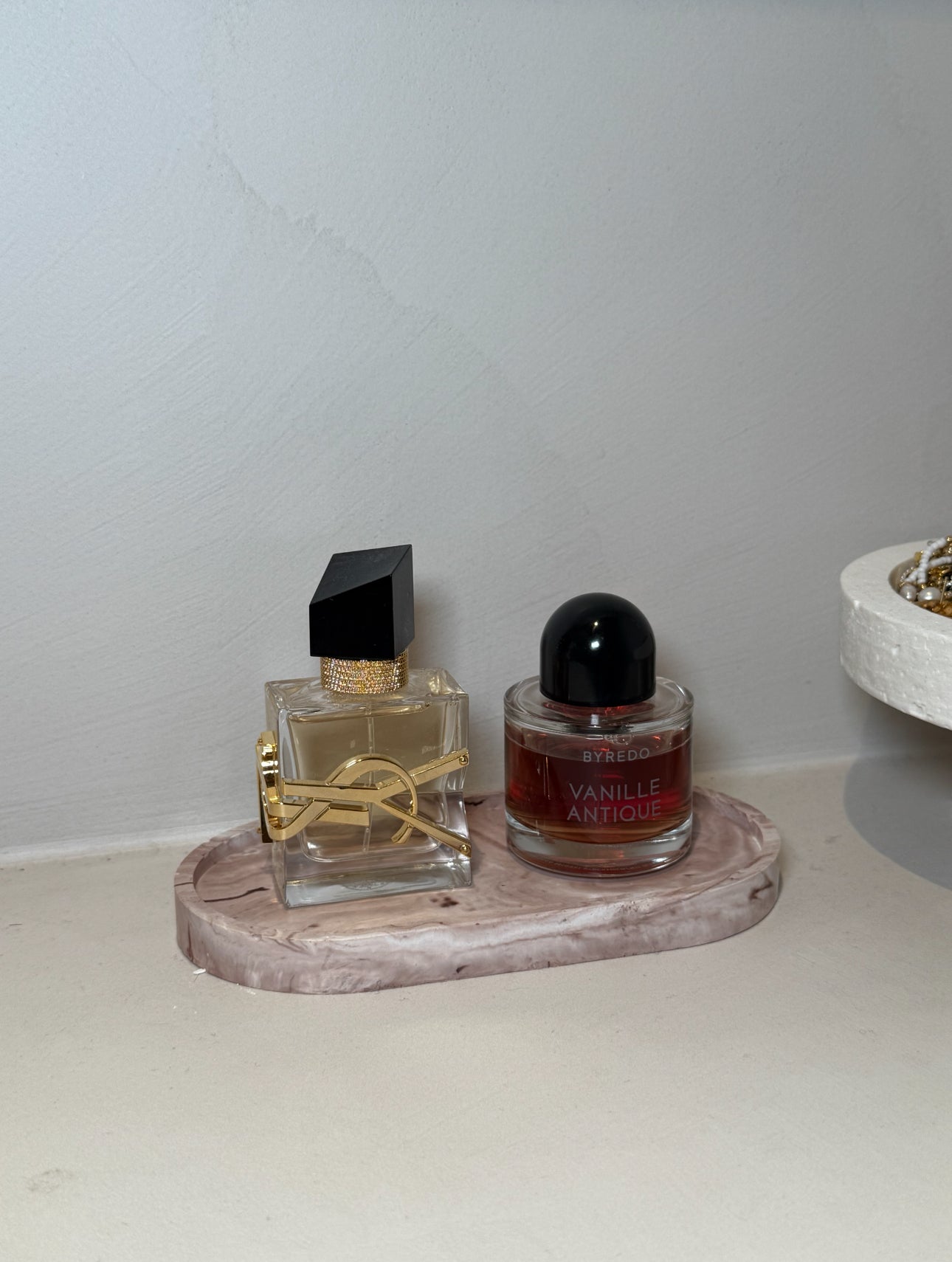 En oval bricka med blank yta i rosa marmorering. Perfekt för att förvara småsaker, använda som smyckesbricka eller låta stå framme som en vacker detalj i hemmet.