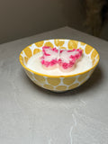 Handgjort ljus i keramikskål med vaxdekorationer