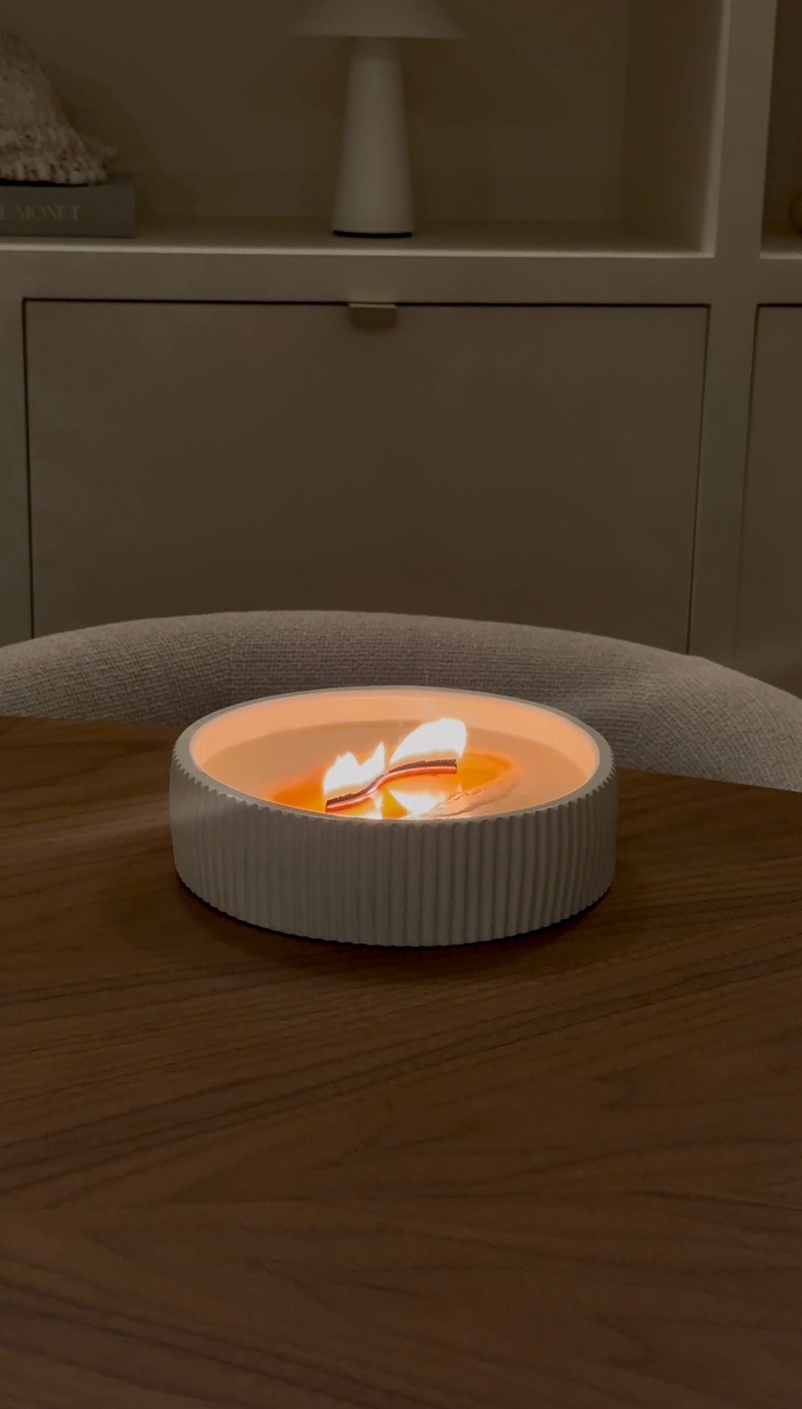 Ett elegant och lågmält designljus i ribbad keramikskål med mjukt sprakande träveke. Ger ett varmt, harmoniskt sken och passar perfekt som inredningsdetalj i alla rum.