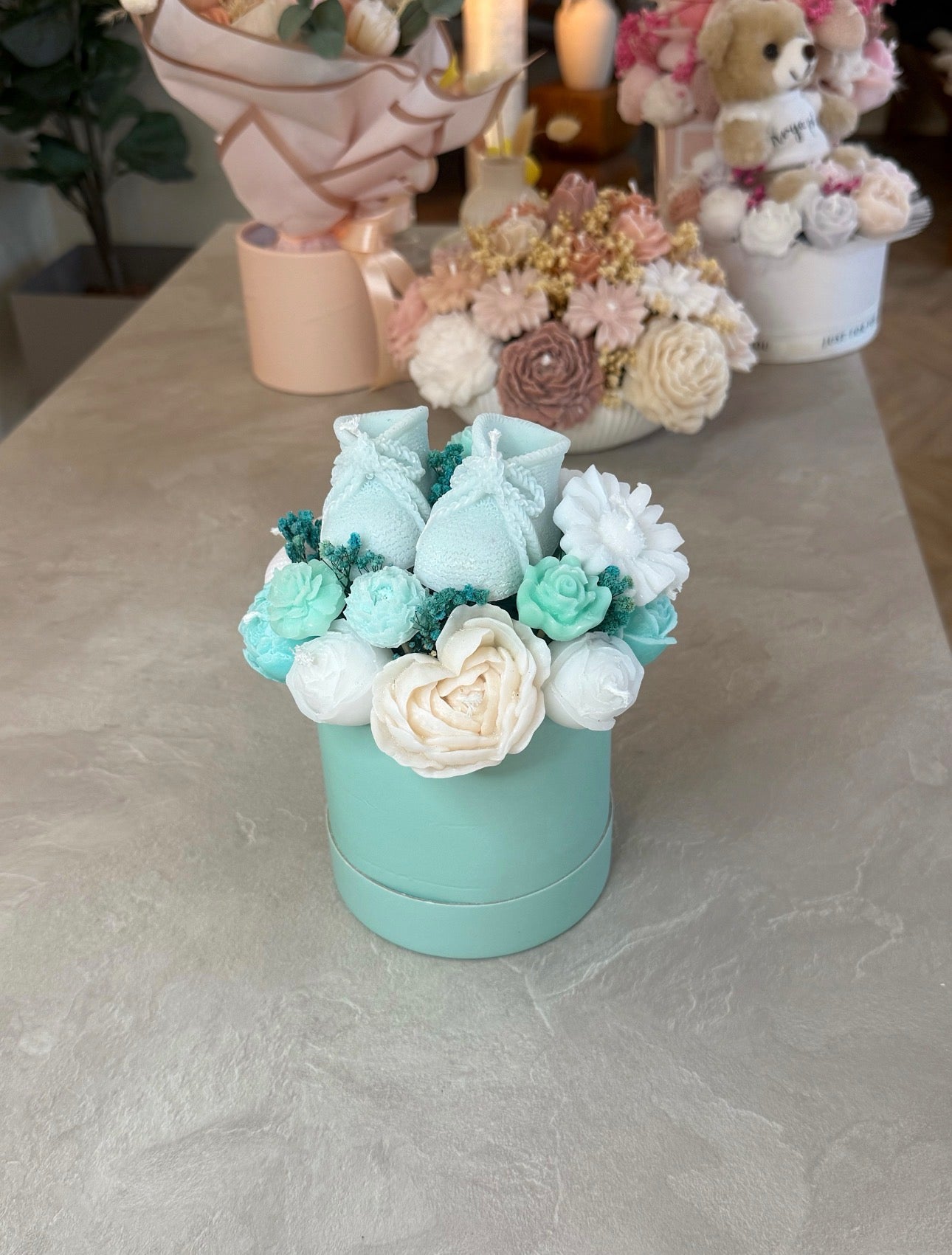 - Handgjord vaxbukett i turkos med små bebis skor