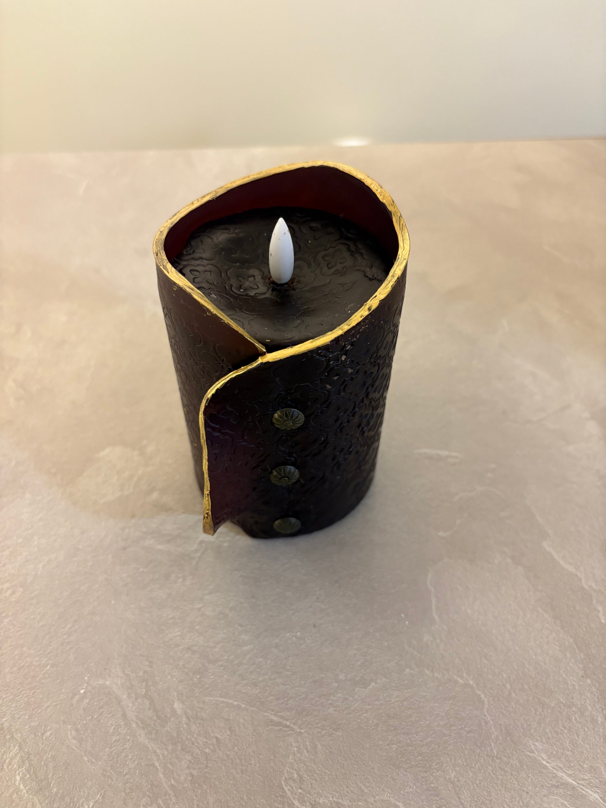Ett handgjort ljus med karaktär och djup. Den mörka, strukturerade ytan möter en rå, sprucken kant som varsamt förädlats med guld. Kontrasten mellan det robusta och det eleganta skapar ett unikt uttryck – som ett litet konstverk för hemmet. Perfekt för att ge rummet en varm och exklusiv känsla.