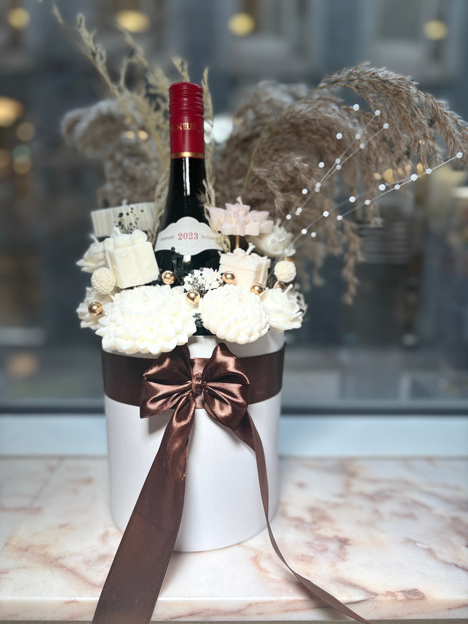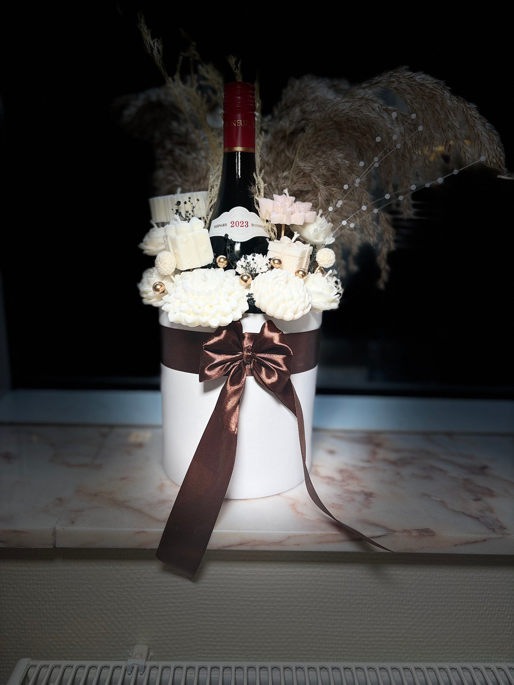 En lyxig presentbox som kombinerar det bästa av två världar – ett alkoholfri vin och handgjorda vaxblommor i mjuka vita toner. Dekorerad med torkade gräs, skimrande detaljer och en sidenrosett i chokladbrunt för en sofistikerad och varm känsla. Perfekt som gåva till vinälskaren eller som elegant inredningsdetalj.