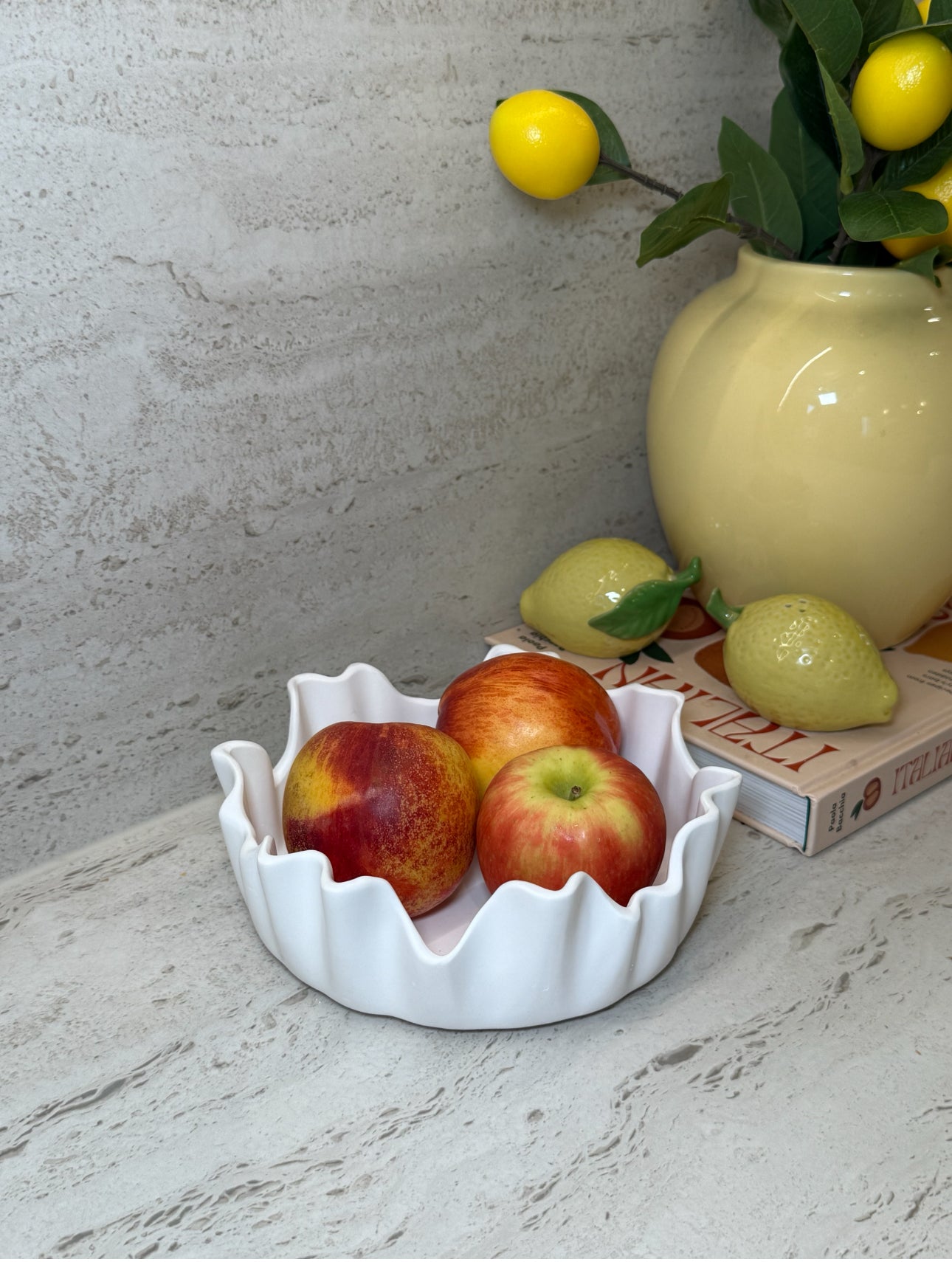 Frakt inom hela Sverige eller upphämtning på plats. Vit skål med organiska vågformer, ett konstnärligt inslag som ger rummet en känsla av rörelse och harmoni.”